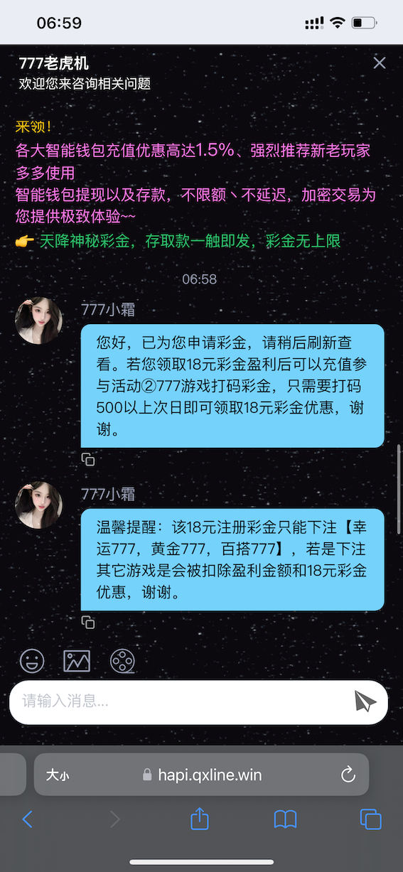 白菜网送彩金平台 777老虎机注册送18彩金 到账情况:自测【充值后果自负】 领取方式:注册送18彩金 安全系数:低 平台资历:未知 会员评分:★☆☆☆☆ 申领网址:https://7700svip.com/ 提现要求:最低提现额度为100元 图例介绍